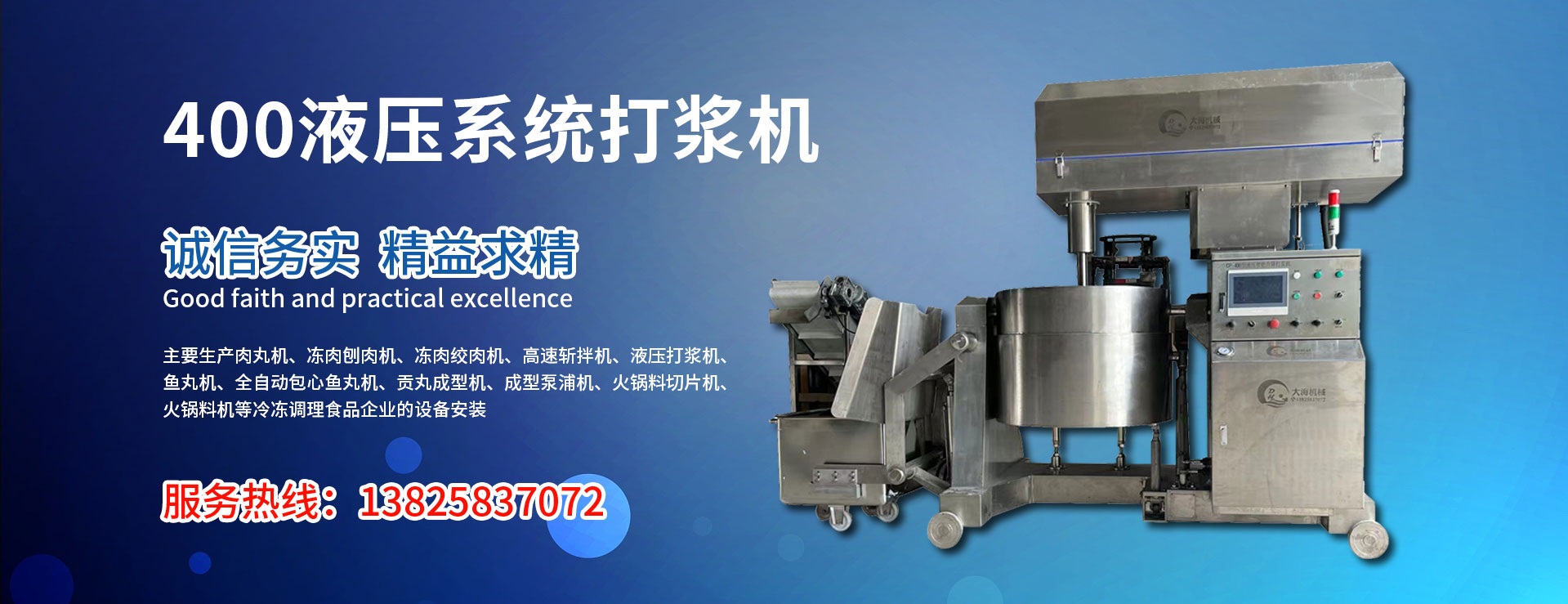 主要生產肉丸機,凍肉刨肉機,凍肉絞肉機,高速斬拌機,液壓打漿機,魚丸機,全自動包心魚丸機,貢丸成型機,成型泵浦機,火鍋料切片機,火鍋料機